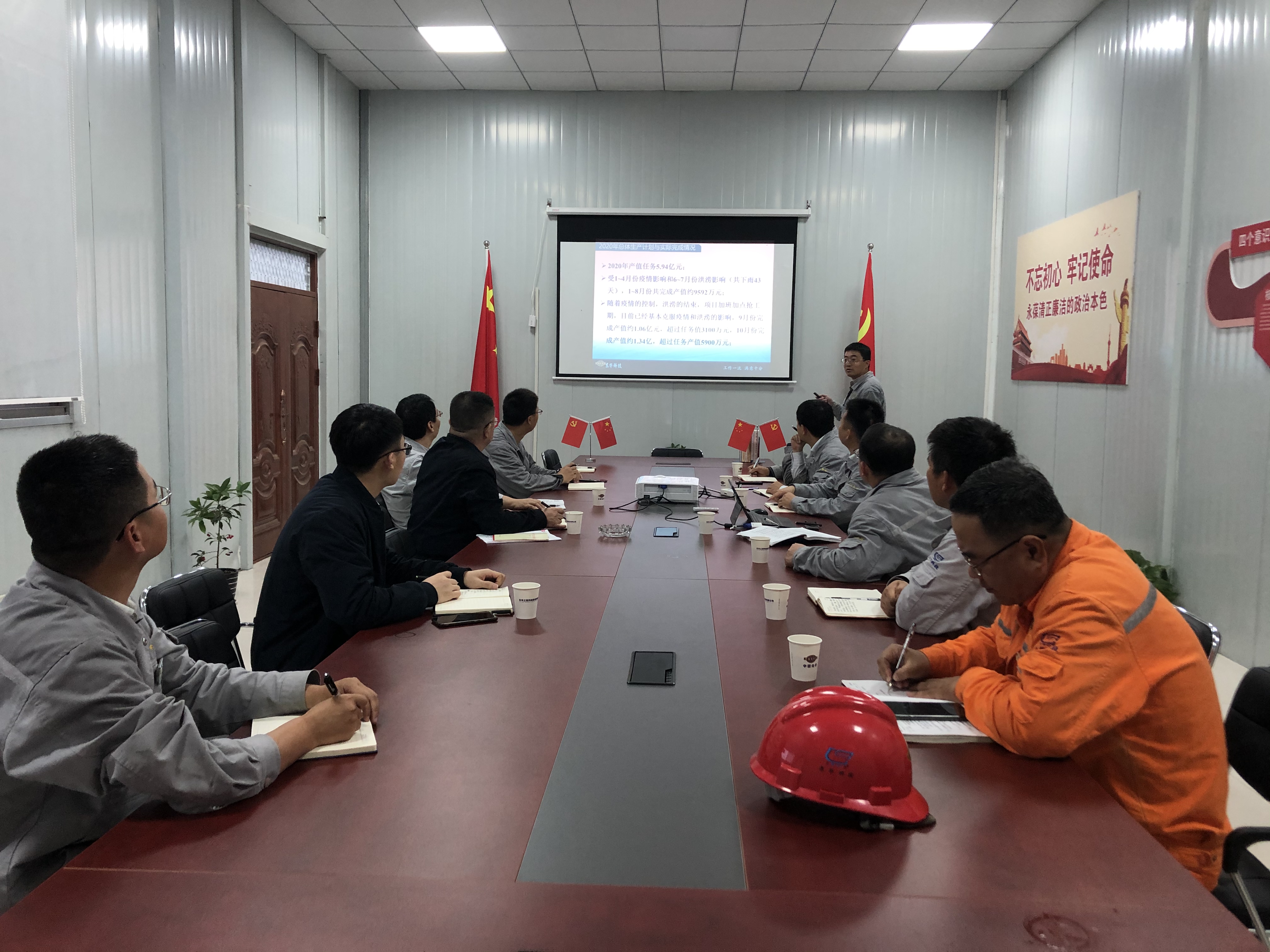 在随后召开的座谈会上,项目党支部书记、项目经理聂磊对项目概况、党建工作开展情况作了详细汇报,并对建设投用的智慧工地系统、正在打造的智慧仓储系统、后续策划实施的施工管理系统等特色管理系统进行了重点展示。他表示,面对疫情和汛期双重影响,项目组全体人员坚持抢工期、赶进度、抓创新,全力以赴完成公司下达的产值指标。